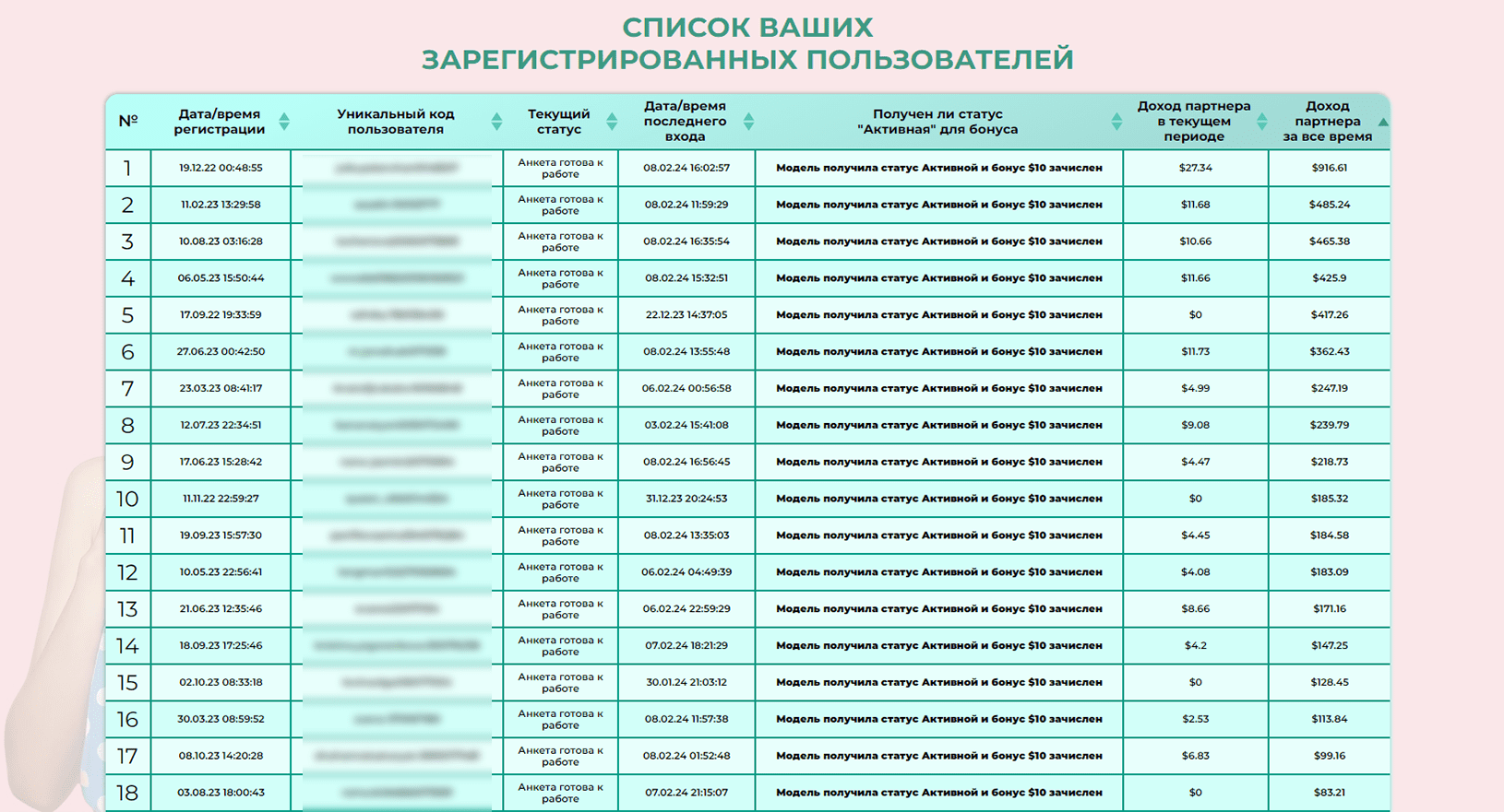 Также вы получите единоразовую бонусную выплату в размере $10 за каждую регистрацию активной модели.