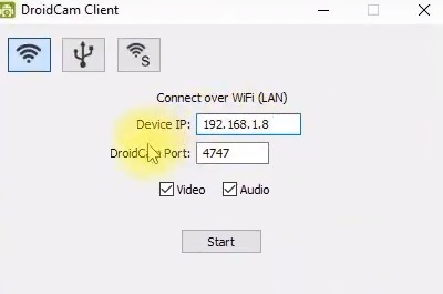 При открытии приложения на телефоне, мы увидим данные, которые необходимы для связи компьютера с вашим смартфоном. (рис. 3) Вводим данные в программу на компьютере. (рис. 4) Проставляем галочки “Video” и “Audio”, нажимаем кнопку “Start”.