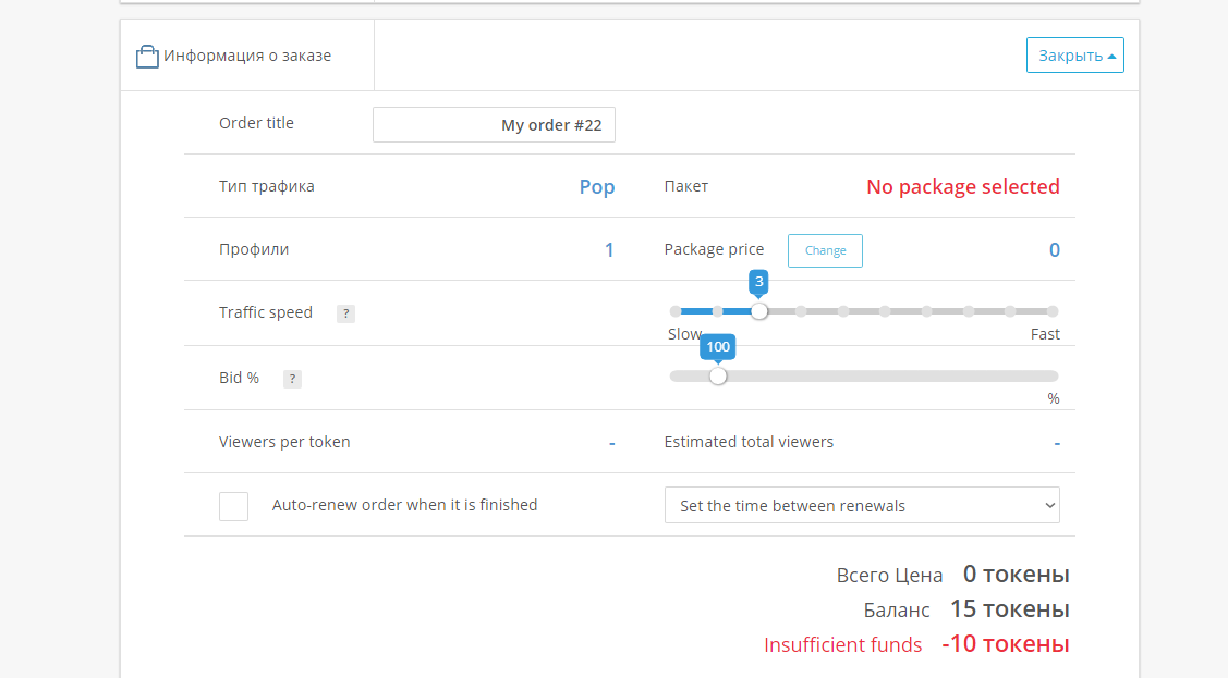 Возвращаемся в Панель управления нажав на верхний логотип сайта, и в самой панели слева, нажимаем кнопку Прокачать выступающих. Появится окошко настройки трафика (рис. 8).