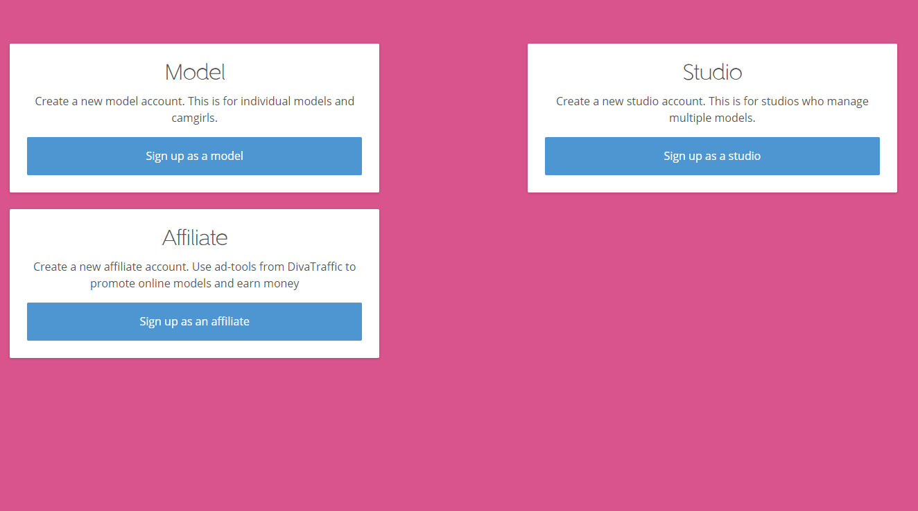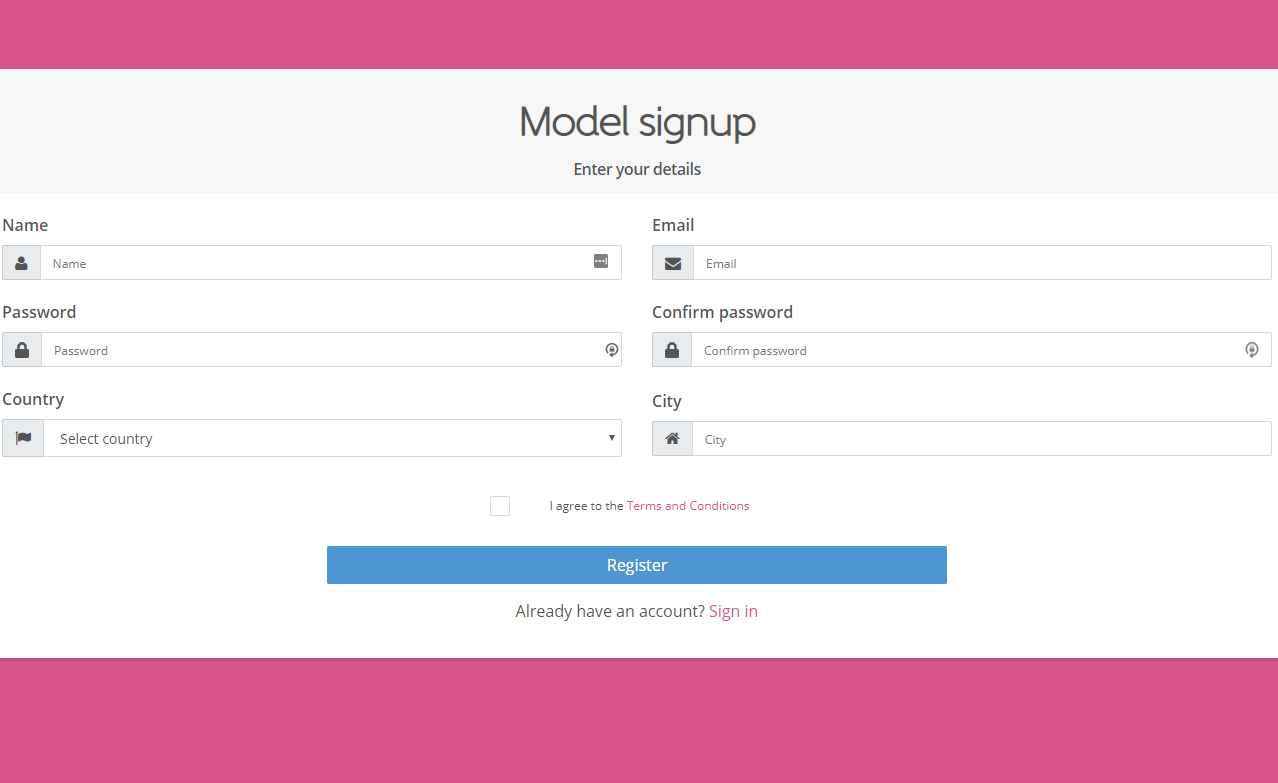 Регистрируемся на сайте. Нажимаем кнопку Sign up возле смены языка, после нажатия, откроется страница с выбором учетной записи, выбираем Model(модель). (рис. 2)