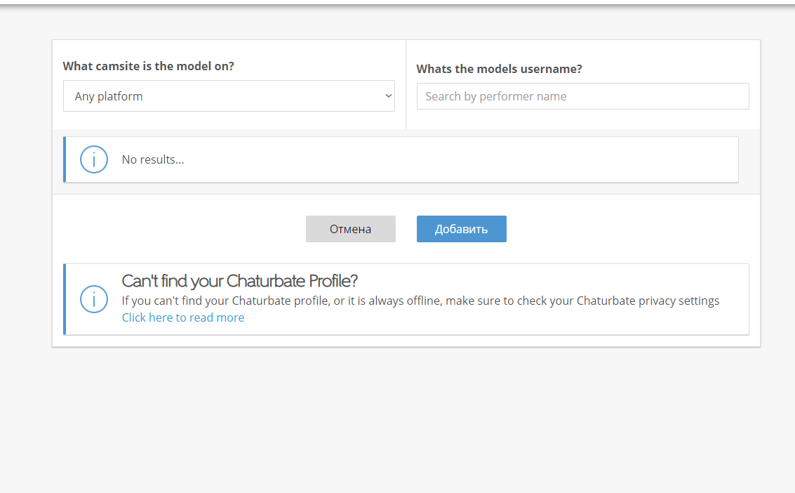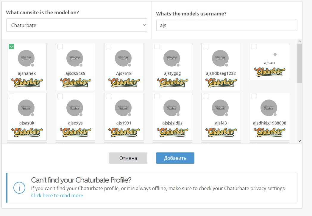 Во вкладке Профили в самом оглавлении жмем большую кнопку + Добавить профиль. Откроется страница, где нам нужно выбрать сайт, на котором находится ваш профиль(Bongacams, Chaturbate и т.д)(рис. 6). Выбираем сайт и вводим название профиля(ваш никнейм на сайте). После успешного ввода, галочкой выбираем ваш профиль. (рис. 7). Жмем кнопку добавить.