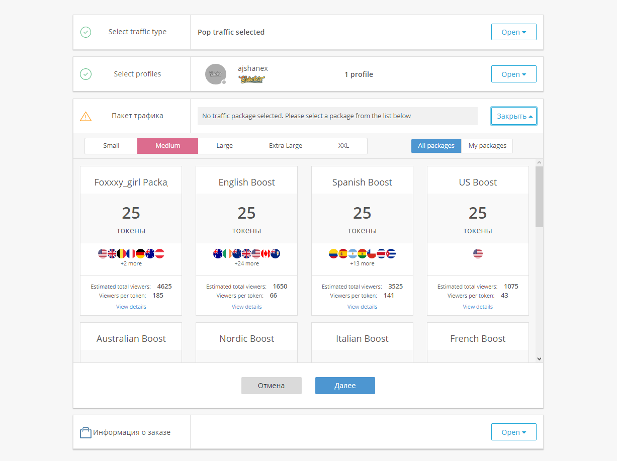 Всего в настройках 3 пункта для выбора. первый оставляем без изменений, второй - выбор вашего профиля на сайте, на который мы будем направлять трафик, третий - выбор пакета для трафика. Здесь стоит внимательно подойти к выбору, в зависимости от времени в котором вы транслируете, пользователей, которые, чаще всего находятся на вашей трансляции, а так же, тематике шоу. К примеру: Если основной костяк вашей трансляции - пользователи с Англии(и англоязычных стран), а время в котором вы транслируете, например, вечер по европейскому времени - то пакет English Boost будет идеальным выбором. Так же при выборе пакета стоит обратить внимание и на его размер ("small" Medium" "large"....)(рис. 9). Для пробного запуска, советую выбрать Medium, а в случае ели эффект от выбранного пакета будет положительно ожидаемым - выбирайте в дальнейшем пакеты Large и Extra Large - их будет хватать на более долгий эффект.