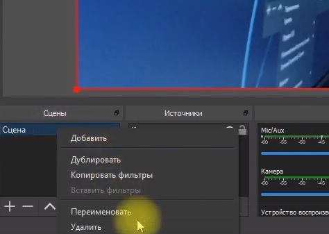 1. Открываем программу OBS, в разделе "Cцены" выбираем активную сцену (по умолчанию, сцена одна). Нажимаем на неё правой кнопкой мыши, и в появившимся меню переходим в фильтры. (рис. 1)