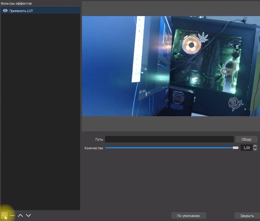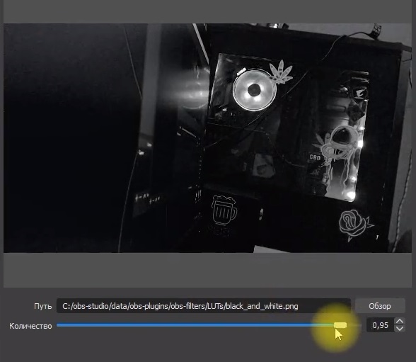 3. Создав новый LUT, необходимо указать путь к нему. В OBS уже есть несколько заранее установленных фильтров, нажимаем кнопку "Обзор" (рис.3), выбираем один из стандартных.