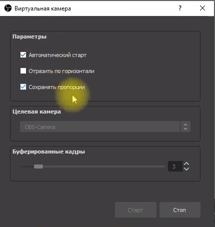Настраиваем сам плагин. Проставляем галочки на пунктах "Автоматический старт" и "Сохранять пропорции". Нажимаем кнопку "Cтарт" и закрываем окно с виртуальной камерой. (рис. 2)