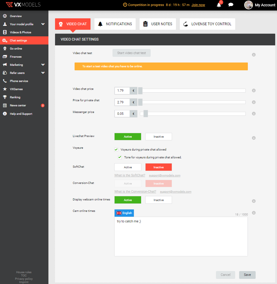 Voyeure - Вы можете отключить возможность платного подглядывания клиентами во время причатного чата. Внимание - отключение этой опции снизит ваш заработок на сайте.