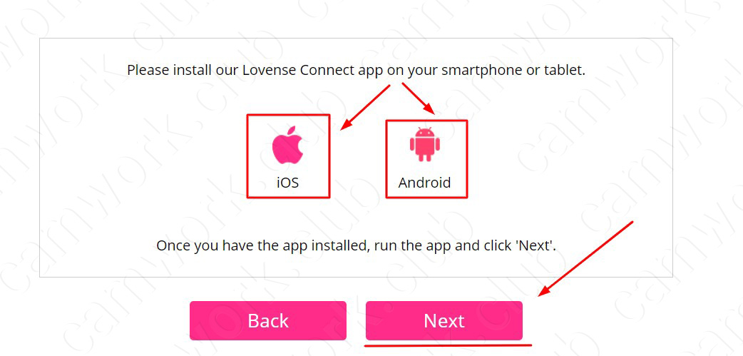 8. На экране появятся значки операционных систем Android и Ios(Iphone), при нажатии на них нас перенесет на магазин приложений выбранной операционной системы. Нажимаем кнопку «Next», после нажатия которой мы увидим QR-код и переходим к настройке Lovense на вашем смартфоне.