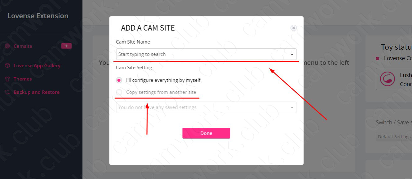 14. На компьютере после сканирования QR кода откроется панель управления игрушкой. В строке «Cam Site Name» вводим, либо выбираем название сайта из списка, к примеру это будет Chaturbate, нажимаем кнопку «Done».