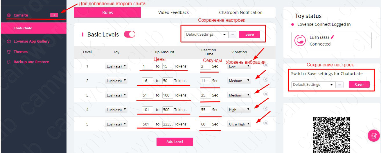 15. Следующим этапом настройки является установка цен, секунд и уровня вибрации на сайте. Необходимо заполнить все пункты как это сделано на скриншоте, количество токенов, уровни вибрации и время вибрации можно подобрать индивидуально. Вы также можете добавить ещё несколько уровней, достаточно нажать кнопку «Add Level» внизу таблицы. После заполнения настроек нажимаем кнопку «Save» сверху таблицы, а после справа от таблицы так же нажимаем «Save». Если вы работаете на нескольких сайтах, для добавления второго сайта используйте кнопку + в левой верхней части панели управления, при добавлении второго сайта появится возможность скопировать настройки с первого, как это указано на прошлом скриншоте.