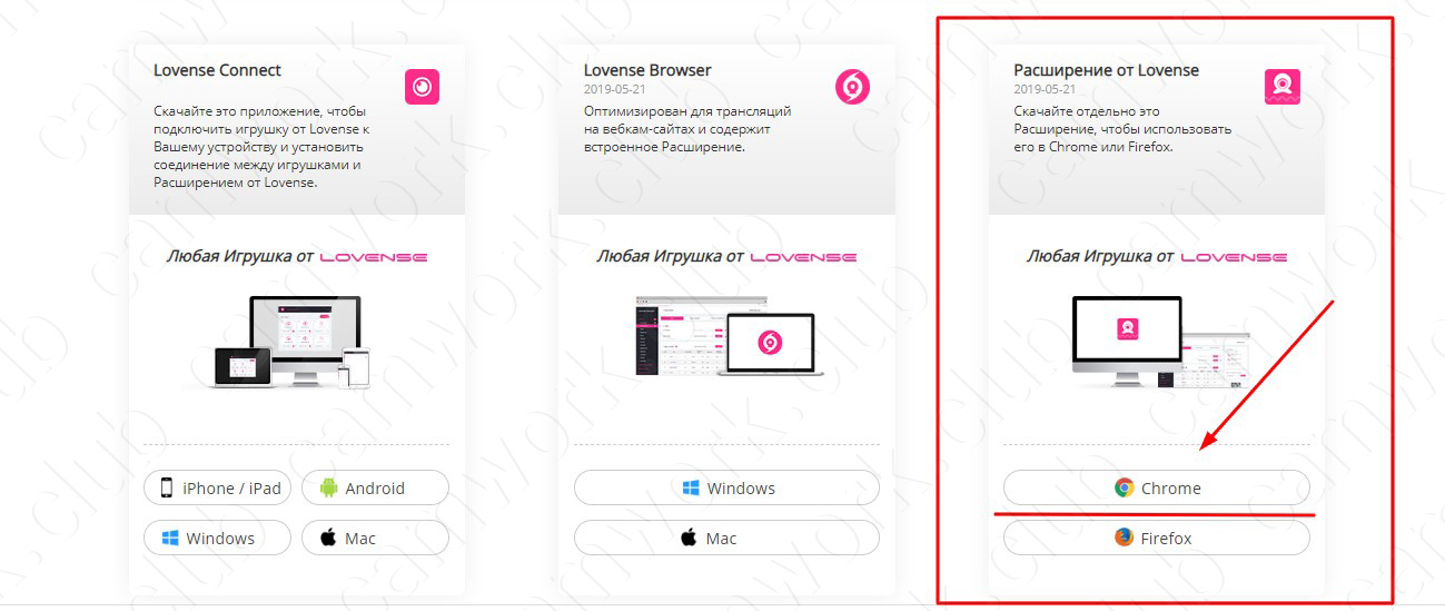 2. После перехода на страницу «загрузки» листаем страницу вниз. Здесь, нам предстоит выбор, установить расширение в браузер, либо, загрузить браузер от Lovense с предустановленным расширением. Рекомендую выбрать именно первый вариант, таким образом вы сохраните все прошлые настройки в браузере, а также расширения в виде переводчика, либо блокиратора рекламы. Выбираем браузер Chrome и скачиваем расширение.