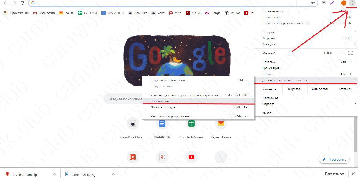 3. Когда архив с расширением загрузится, открываем его и переносим файлы в заранее созданную папку в любом месте на компьютере, например, на рабочем столе создаем папку «Lovense». Снова открываем браузер, нажимаем на 3 точки в правом, верхнем углу браузера, выбираем пункт «Дополнительные инструменты» после переходим в «Расширения».
