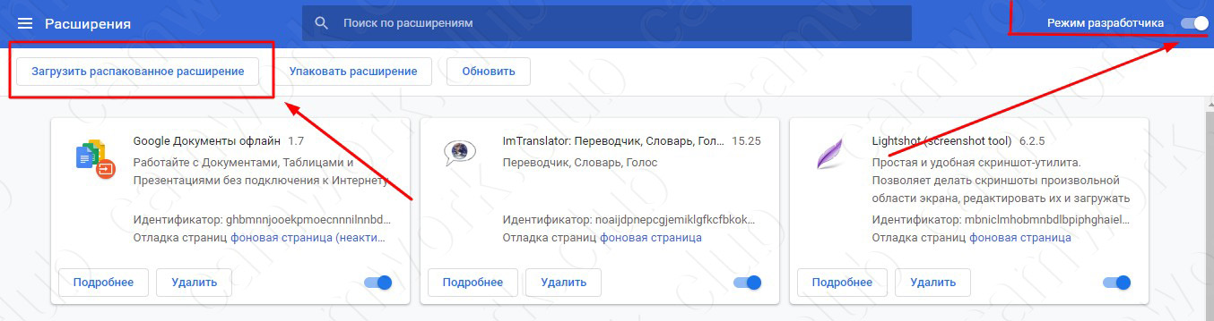 4. В «Расширениях» передвигаем флажок «Режим разработчика» и нажимаем кнопку «Загрузить распакованное расширение».